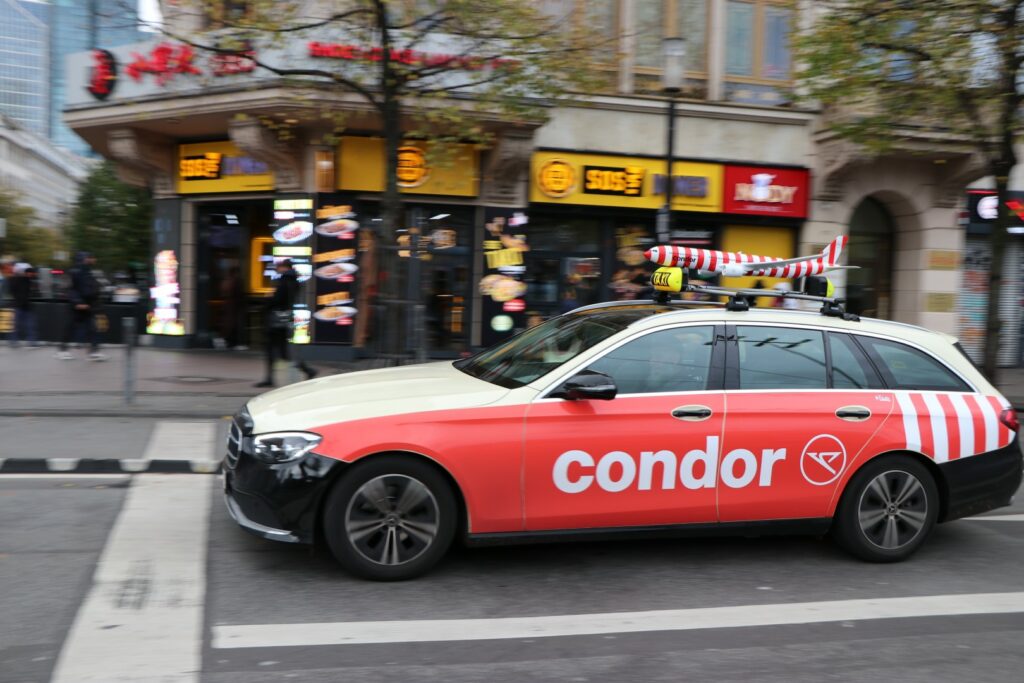 Zum Kampagnenstart im Oktober 2025 haben wir gemeinsam mit Condor, dentsuX und Cabvertising eine außergewöhnliche Sonderumsetzung realisiert, die die Marke Condor wortwörtlich zum Abheben bringt: Fünf gebrandete Taxis fahren aktuell durch Frankfurt, gekrönt von 3D-Condorflugzeugen auf den Dächern. In Grün, Rot und Blau schweben die ikonischen Condor-Streifen noch bis Mitte Februar 2026 durch die Stadt …