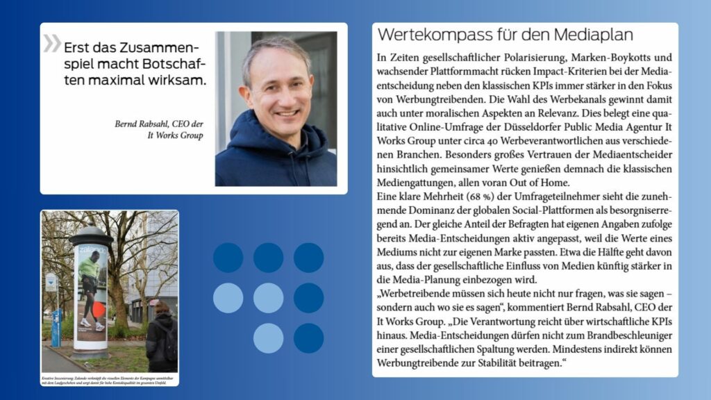 Das erste digitale OOH! Magazin 2024 ist frisch veröffentlicht und wir freuen uns nicht nur über jede Menge spannende Insights, sondern ganz besonders darüber, dass wir von It Works Group es mit unserem Engagement auch in das Heft geschafft haben – mit einem Feature über unsere Germanys next Topmodel Rheinturm-, und (D)OOH Kampagne.In einem Beitrag wird unsere innovative (D)OOH Kampagne rund um „Germany\’s next Topmodel“ am Düsseldorfer Rheinturm hervorgehoben. Wir durften Heidi Klum und ihre Kandidatinnen nicht nur auf klassischen sowie digitalen Werbeträgern präsentieren, nein – wir durften eine atemberaubende Vollfassaden-Projektion am Rheinturm durch unseren Mediamix perfekt machen. Die Projektion war nicht nur ein unübersehbares Highlight in unserer Heimatstadt Düsseldorf, sondern zugleich auch ein Highlight für uns.Und als ob das nicht schon genug wäre, wurden wir gemeinsam mit Andreas Heintze von Ströer, Daniel Siegmund (Co-Founder und Managing Director der One Tech Group GmbH) und Holger Walsch (Geschäftsleiter planus media GmbH) auch nochmal in der Rubrik “OOH! – Fokus” in dem Beitrag “OOH: Starker Partner für Retail Media” erwähnt. Hier brachte unser CEO Bernd Rabsahl das Zusammenspiel von Außenwerbung und Retail auf den Punkt: “OOH-Medien sind im Retail Media Bereich eine ideale Ergänzung, insbesondere an allen Touchpoints vor der finalen Kaufentscheidung. Gegenüber anderen Retail Medien ist DOOH unübersehbar in digitaler Form vor Ort präsent – granular und flexibel nach Zeit und Einsatzgebiet buchbar.”Neben uns gibt es natürlich noch viele weitere spannende Insights wie aktuelle Marktzahlen oder eine Einschätzung zu neuen Möglichkeiten für Programmatic Advertising, uvm.
